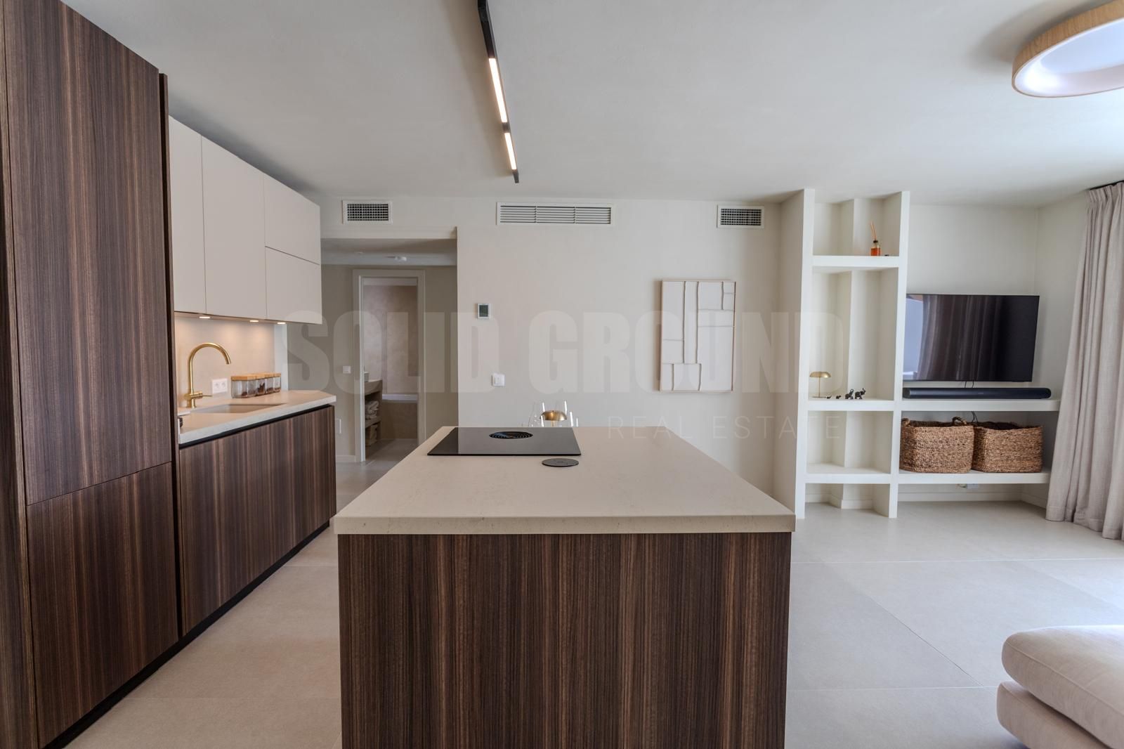 The bathrooms are entirely finished in microcement with built-in fixtures, creating a clean and sophisticated look. Large-format 120×120 tiles have been used throughout the property, seamlessly extending from the interior living areas to the outdoor terraces.
