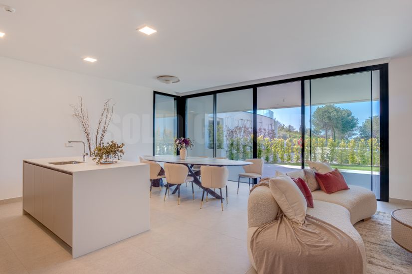 Stunning south-facing ground-floor apartment located in the exclusive Marbella Sunset residential complex in Cabopino. This contemporary home combines modern design with comfort and elegance, featuring a spacious private terrace ideal for relaxing or enjoying outdoor dining under the Mediterranean sunshine.The property offers three bedrooms and three bathrooms. The fully equipped kitchen is finished with high-quality materials and designed for both style and functionality. The bright and spacious living-dining area connects seamlessly with the terrace and outdoor space, creating an inviting indoor–outdoor living experience. Additional features include hot and cold air conditioning and two private parking spaces. The residential complex boasts beautifully landscaped gardens and swimming pools, providing an exclusive and tranquil atmosphere. The area also offers a great selection of nearby amenities, including restaurants, schools, the beach, and golf courses, making this property an ideal option for both permanent living and as a second home.