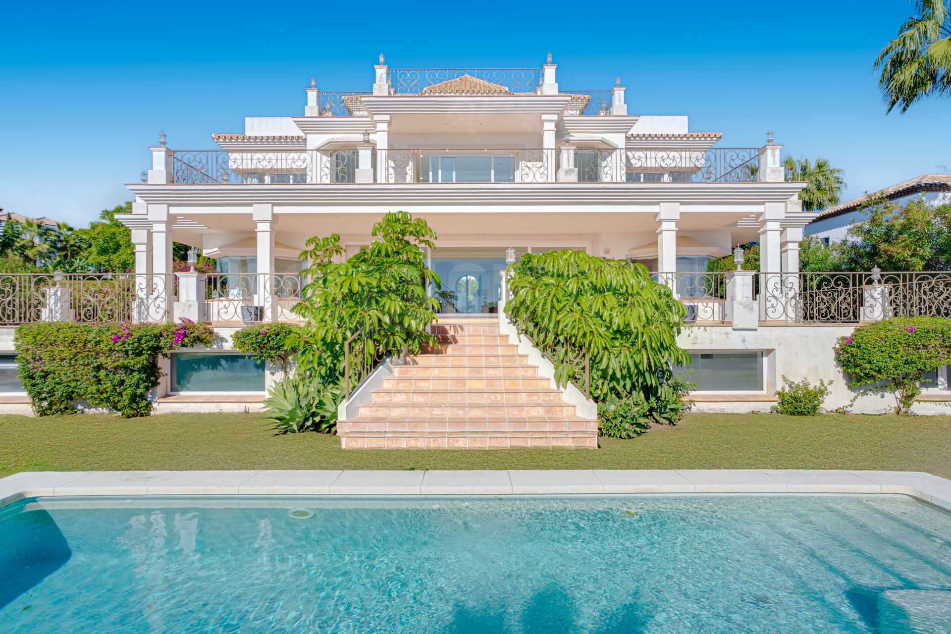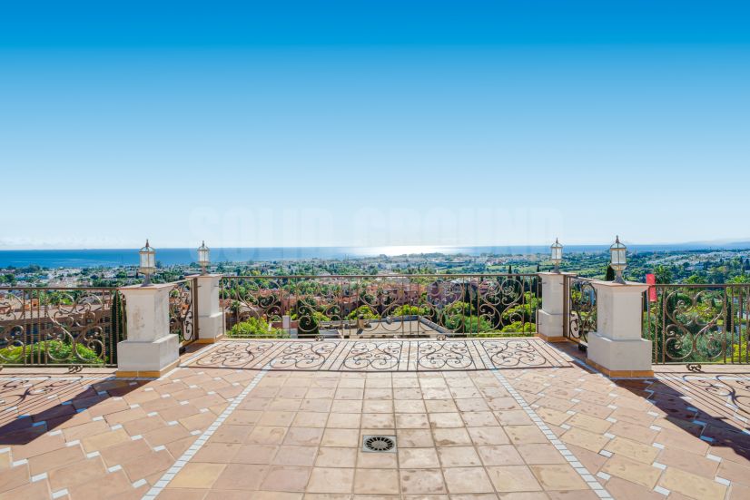 Exceptional eight-bedroom, south-facing villa located in the prestigious gated community of Los Flamingos, Benahavis, offering 24-hour security, a private garden, and a private pool, all within close proximity to amenities. Spanning four impressive levels, including a vast solarium with breathtaking panoramic sea views, this remarkable residence welcomes you with a grand entrance showcasing spectacular views. The villa features two elegant living rooms, a large kitchen with utility room, private garage for four cars, large driveway, and lift connecting all floors. The master suite boasts his and hers bathrooms and walk-in closets, while all three bedrooms on the first floor enjoy direct access to a spacious terrace overlooking the sea. Each bedroom is en suite, complemented by three additional guest toilets. The versatile lower level offers immense potential, with numerous adaptable rooms and independent access from the garage, making it ideal for creating a self-contained apartment. This extraordinary property offers a perfect blend of luxury, space, and endless possibilities.