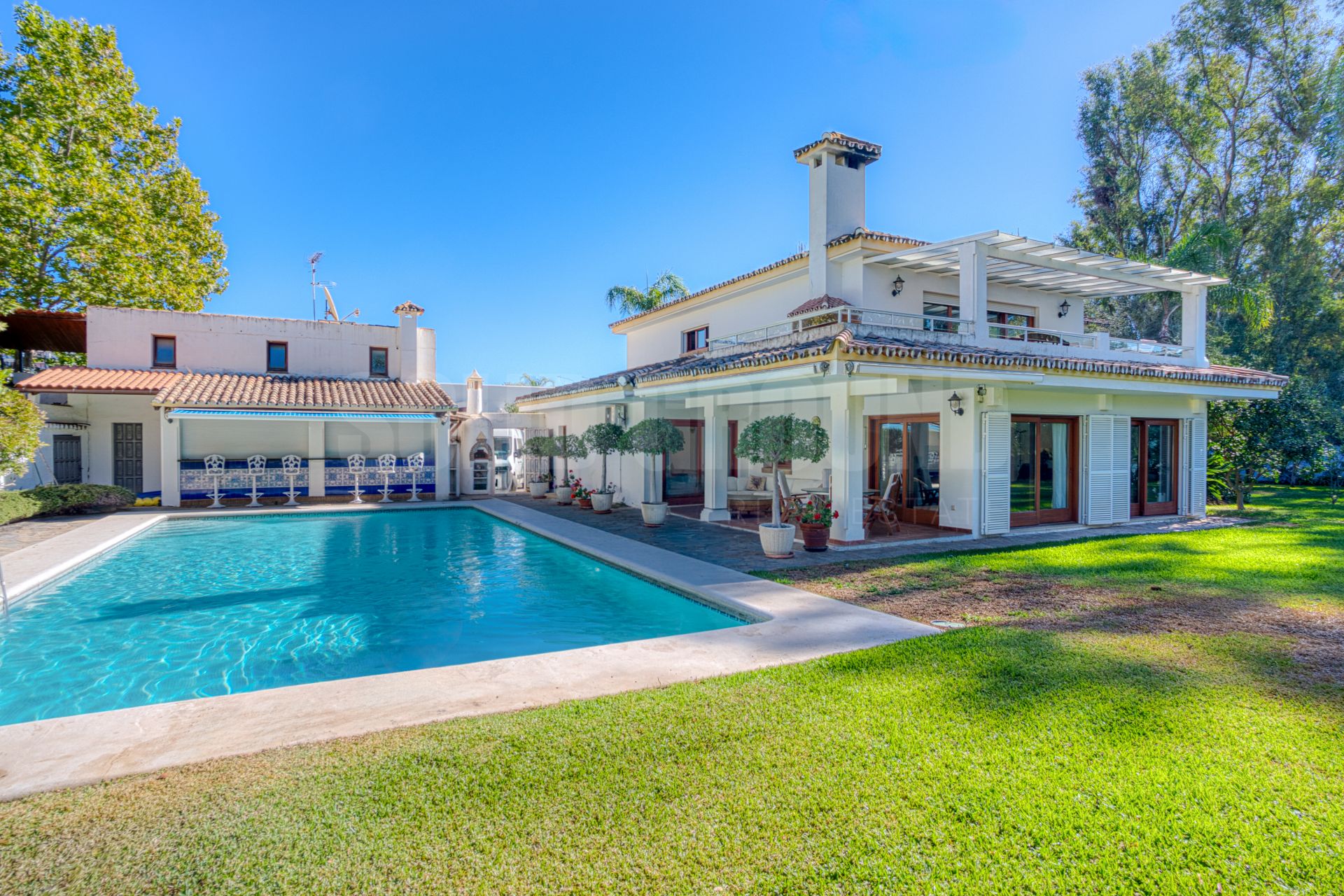 Reform opportunity, southeast facing five bedroom Villa located on the New Golden Mile in Estepona, just steps from the beach, offering an ideal blend of space, privacy, and investment potential. Set on a generous plot, the property features bright interiors filled with natural light, five bedrooms, four bathrooms, and expansive outdoor spaces with a private swimming pool, landscaped gardens, an outdoor kitchen and bar area, and ample parking with a spacious double garage and driveway, perfect for relaxation or entertaining. While comfortable and ready to move into, the villa also provides excellent scope for renovation and modernization, presenting a rare opportunity to add value in one of the Costa del Sol’s most desirable locations, close to golf courses, international schools, Marbella, Puerto Banús, and the lively center of Estepona.